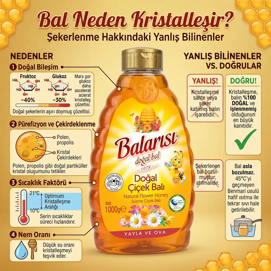 Balın kristalleşmesi, tüketiciler tarafından pek anlaşılmayan bir konudur. Birçok kişi, kristalleşmiş balın hileli veya doğal olmayan bir ürün olduğunu varsayar. Bu doğru değildir. Aslında, kristalleşme süreci doğal ve kendiliğinden gerçekleşir. Çoğu saf, işlenmemiş veya ısıtılmamış bal, zamanla doğal olarak kristalleşme eğilimindedir. Kristalleşme, balın rengi ve dokusu dışında hiçbir etkisini göstermez.
